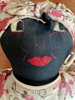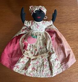 Antique African American Black Cloth Rag Doll Folk Art Peach on Dress Americana. Can "sit up", has a rectangular shaped piece sewn into its lower body to support her seated (see photos). One earring, as intended by the maker. Dress has some wear, tears, as shown.
