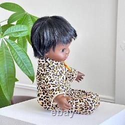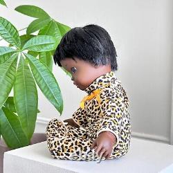 RARE 1969 Shindana Dee Bee baby girl doll African American black straight hair complete cheetah leopard print outfit toy clean VERY pretty doll w/ great face paint makeup, super nice condition plastic rubber head and hands and soft stuffed body in original outfit. About 16 tall toes to top of head.